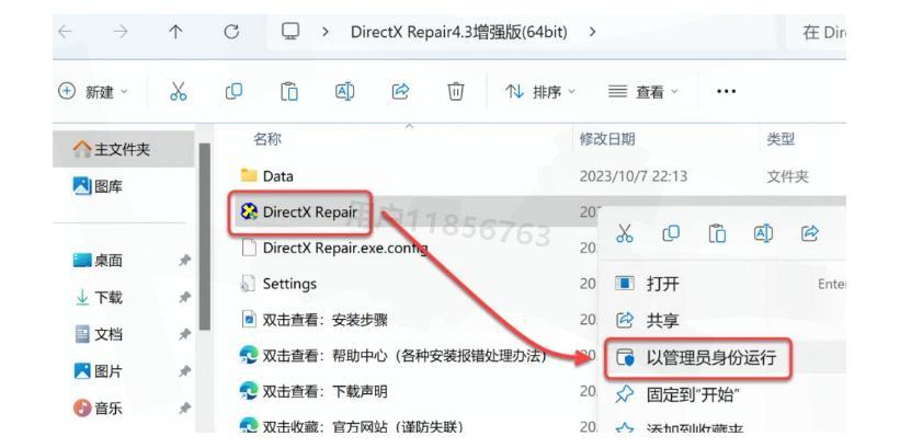 第2步:运行程序 打开刚才解压出来的文件夹,找到【DirectX Repair V4.3增强版(64bit)】主程序,鼠标右击选择【以管理员身份运行】。这一步很关键,不用管理员权限可能会修复失败!