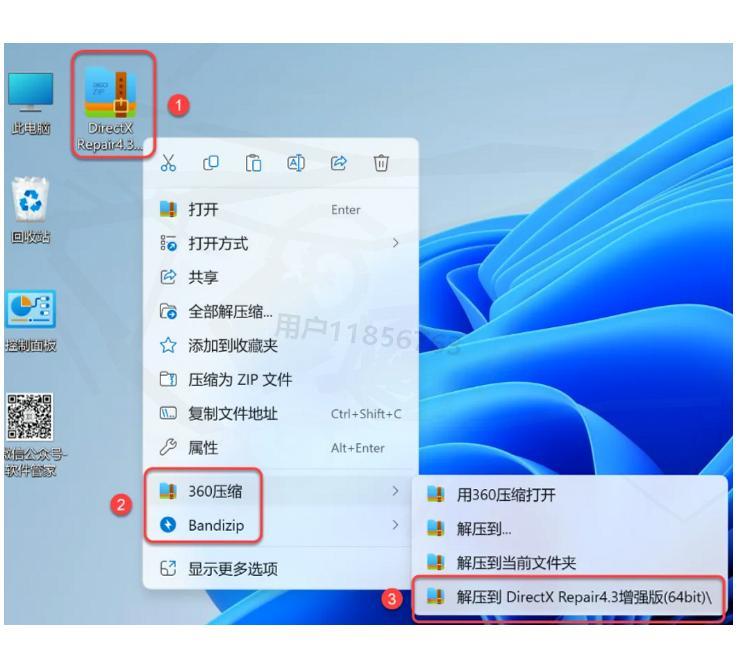 第1步:先解压DirectX Repair安装包 ① 鼠标右击【DirectX Repair V4.3增强版(64bit)】压缩包 ② 选择你电脑上装的解压软件(比如360压缩) ③ 点击【解压到DirectX Repair V4.3增强版(64bit)】