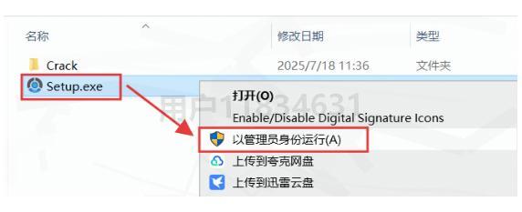 - 找到【Setup】程序后,别急着直接点击,我们需要鼠标右键点击它,然后选择【以管理员身份运行】。这一步很关键,否则可能没有足够的权限完成安装: