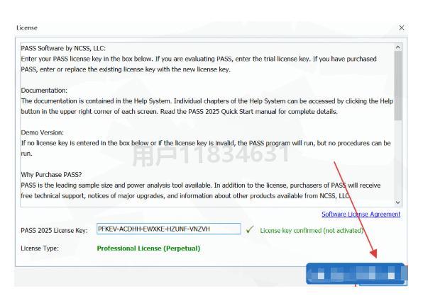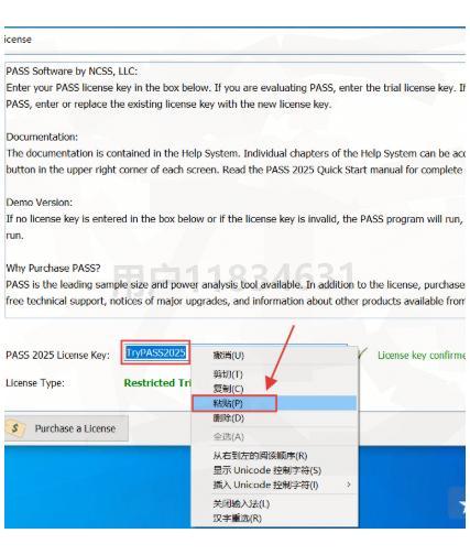 - 在弹出的注册窗口中,选中【PASS 2025 License Key】右边的输入框内所有内容,然后右键选择【粘贴】: