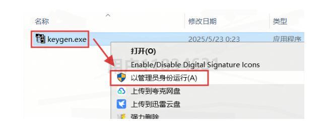 - 在Crack文件夹中,找到【keygen】程序,同样是右键选择【以管理员身份运行】。这里有个小插曲,如果你发现这个文件夹是空的,多半是因为杀毒软件或系统防护把文件当成了威胁并删除了。解决方法就是退出杀毒软件后重新解压原始文件。
