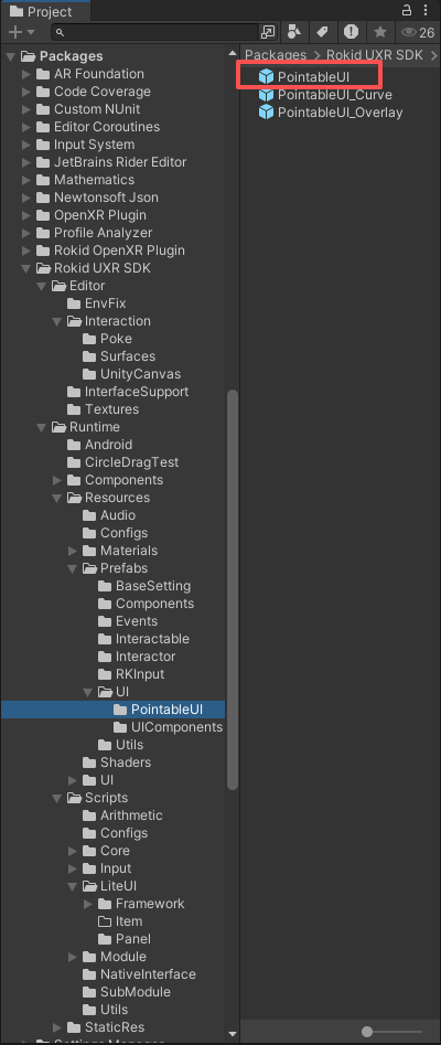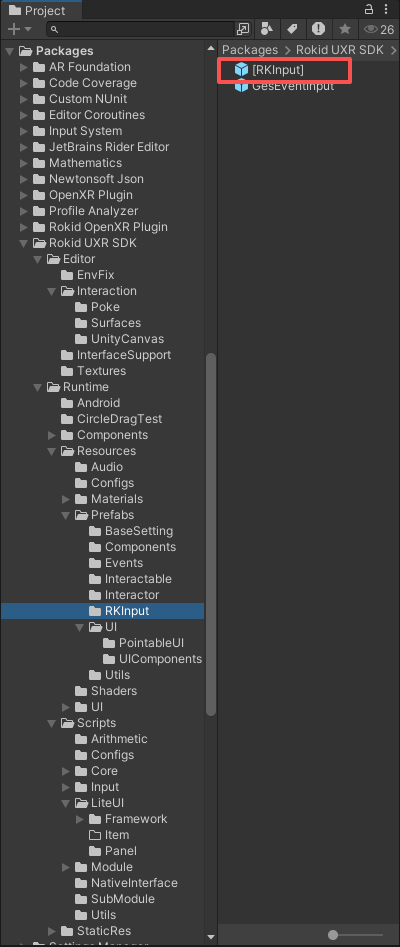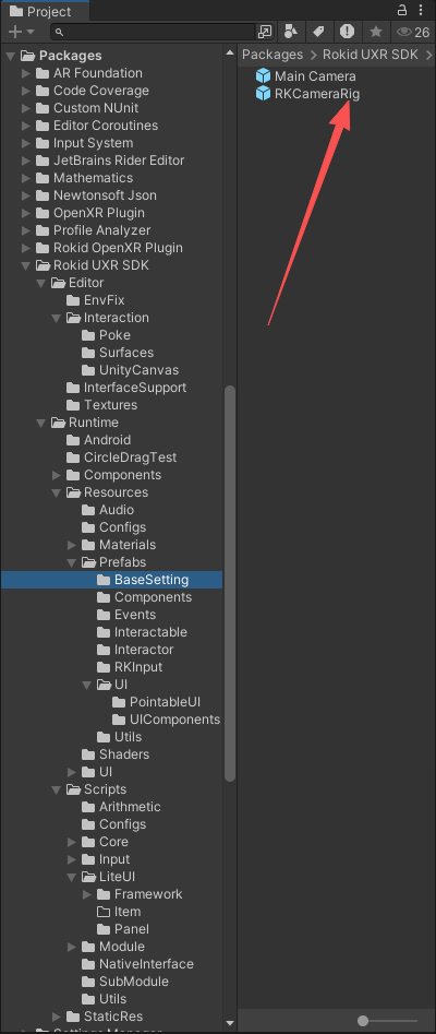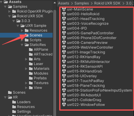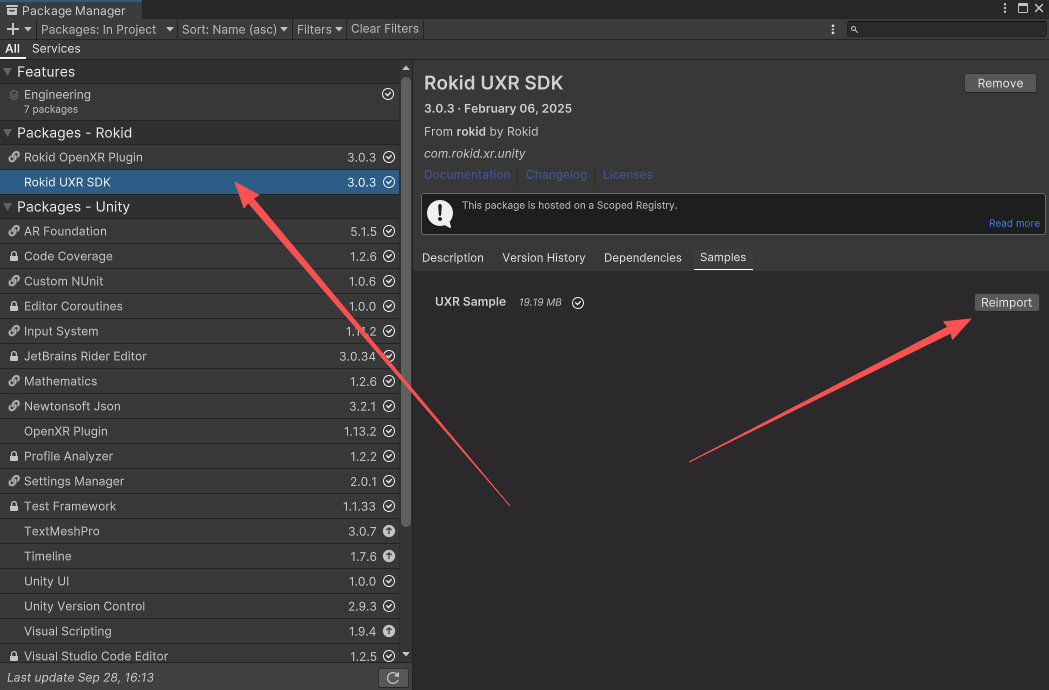 导入示例demo步骤: 第一步先打开:Package Manager 第二步:选择Rokid UXR SDK 在选择Sampies 点击Install就可以了