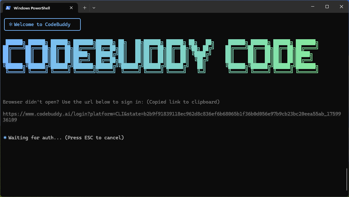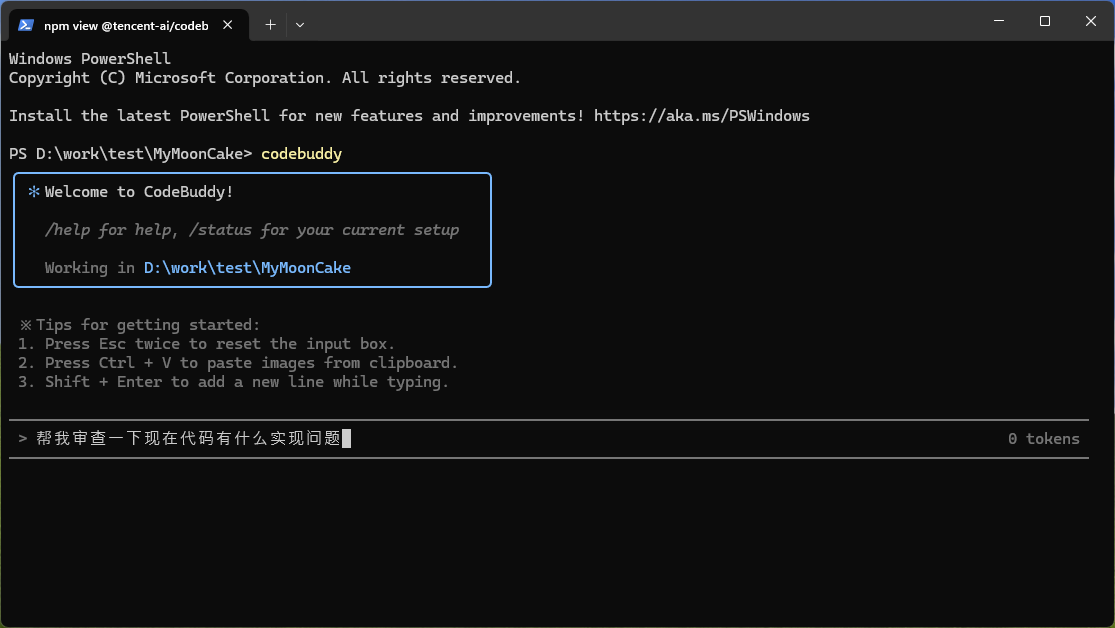 npm install -g @tencent-ai/codebuddy-code安装完成后,在 PowerShell 中输入: