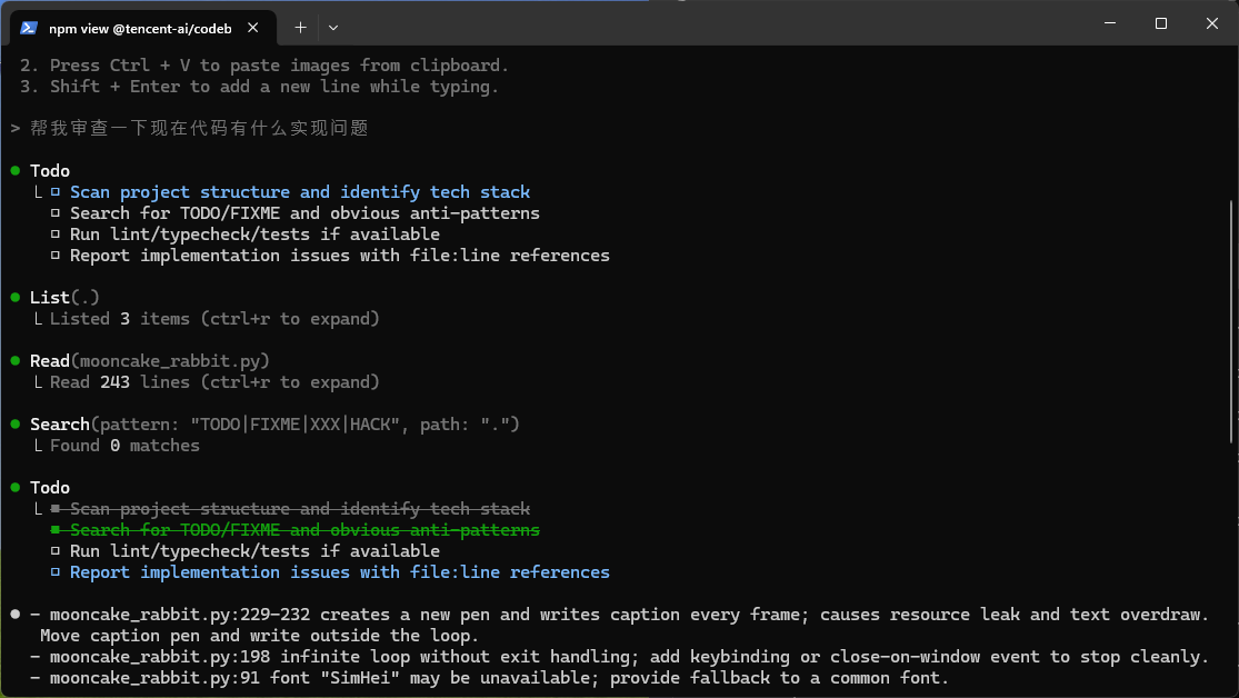 CLI 会自动分析代码结构、逻辑与风格问题,并给出详细的审查意见。AI 提到几点改进建议,比如“优化玉兔绘制函数的结构”“添加颜色渐变增强层次感”等。