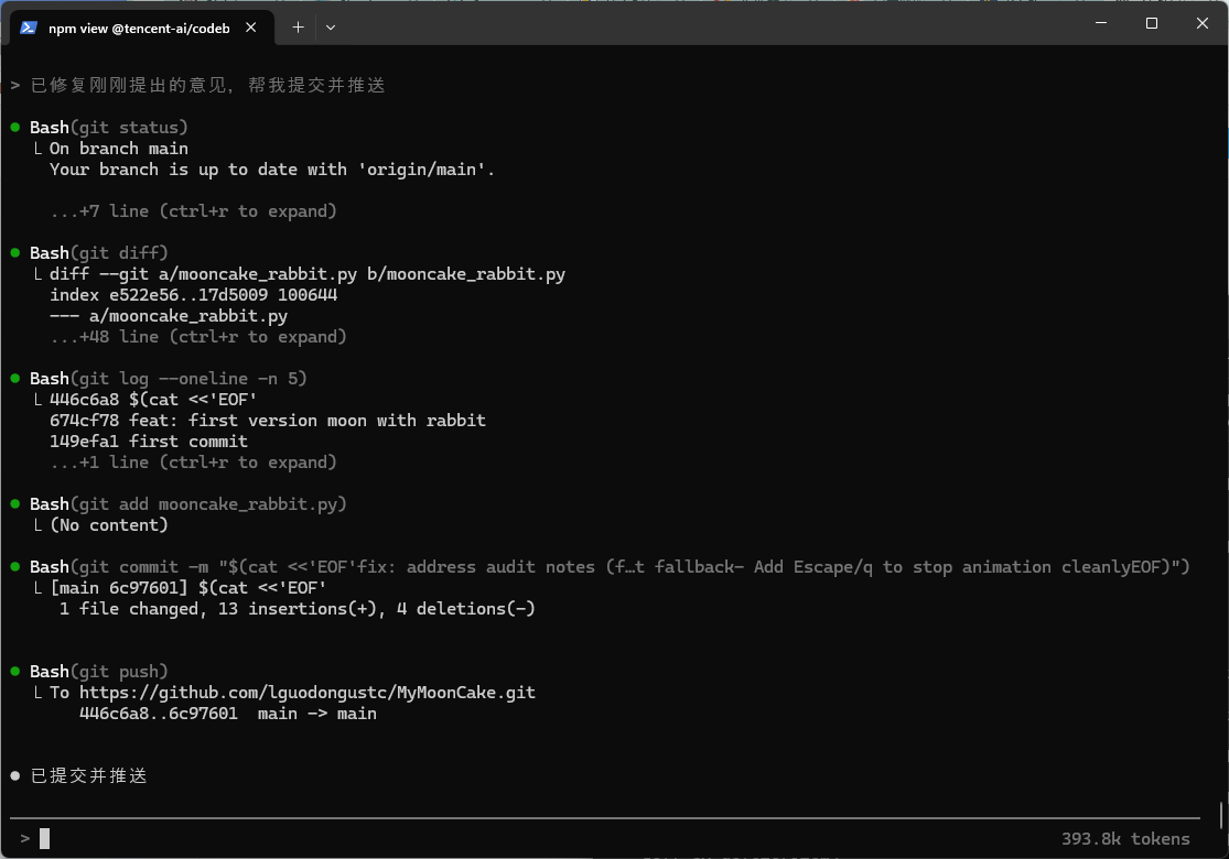 除了代码生成与审查,CodeBuddy CLI 还在版本管理中展现了实用价值。 通过简单的命令,它能帮你自动生成符合语义化规范(Conventional Commit)的提交信息,并执行 Git 提交和推送操作。