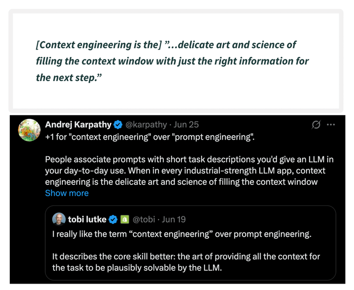 简单来说,上下文工程是将正确的信息以正确的格式在正确的时间传递给LLM的艺术和科学。 这是安德烈·卡帕西关于上下文工程的名言...