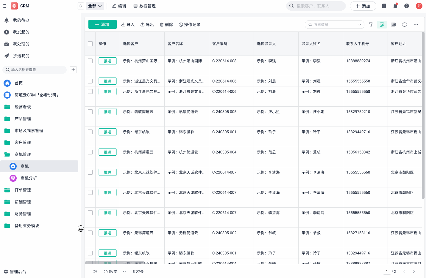 注:本文示例所用方案模板:简道云销售管理系统,给大家示例的是一些通用的功能和模块,都是支持自定义修改的,你可以根据自己的需求修改里面的功能。