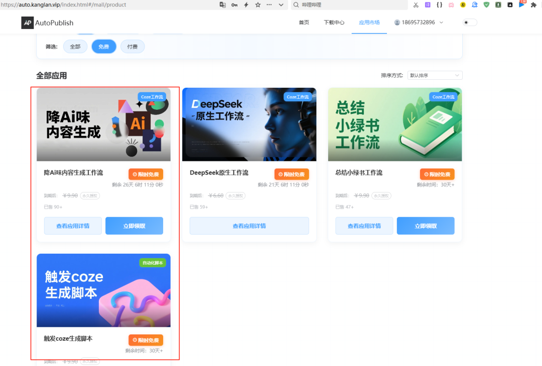 接着我们进入网站的应用市场,找到“触发coze生成脚本”和“降AI味内容工作流”,这两个是免费的,点击立即获取,获取一下。