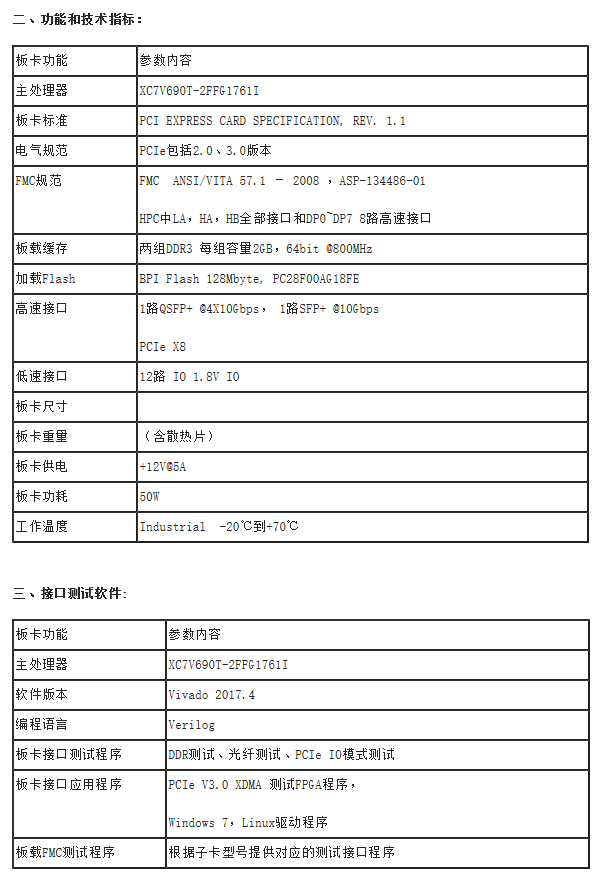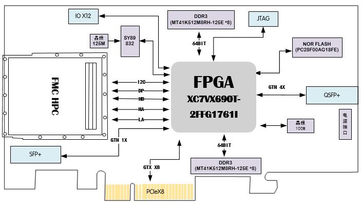 本板卡基于Xilinx公司的FPGA XC7VX690T-FFG1761 芯片,支持PCIeX8、两组 64bit DDR3容量8GByte,HPC的FMC连接器,北京太速科技板卡支持各种FMC子卡扩展。软件支持windows,Linux操作系统。
