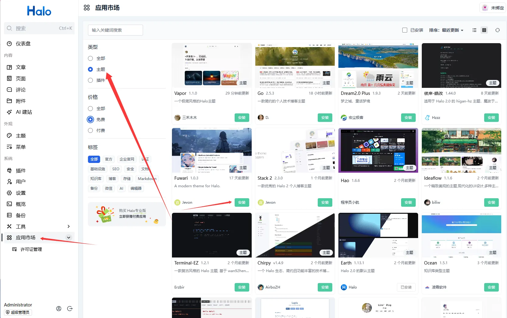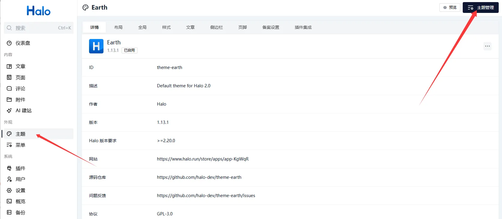 2.安装完毕后,选择左侧的主题,右上角的主题管理