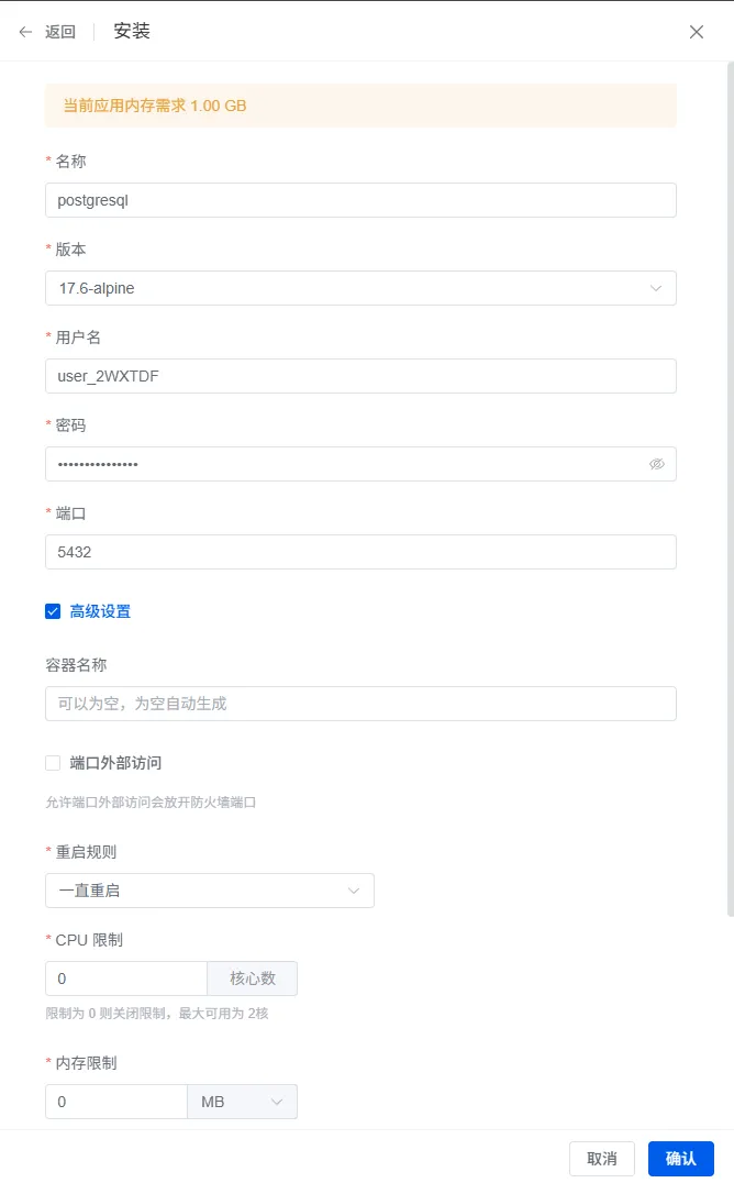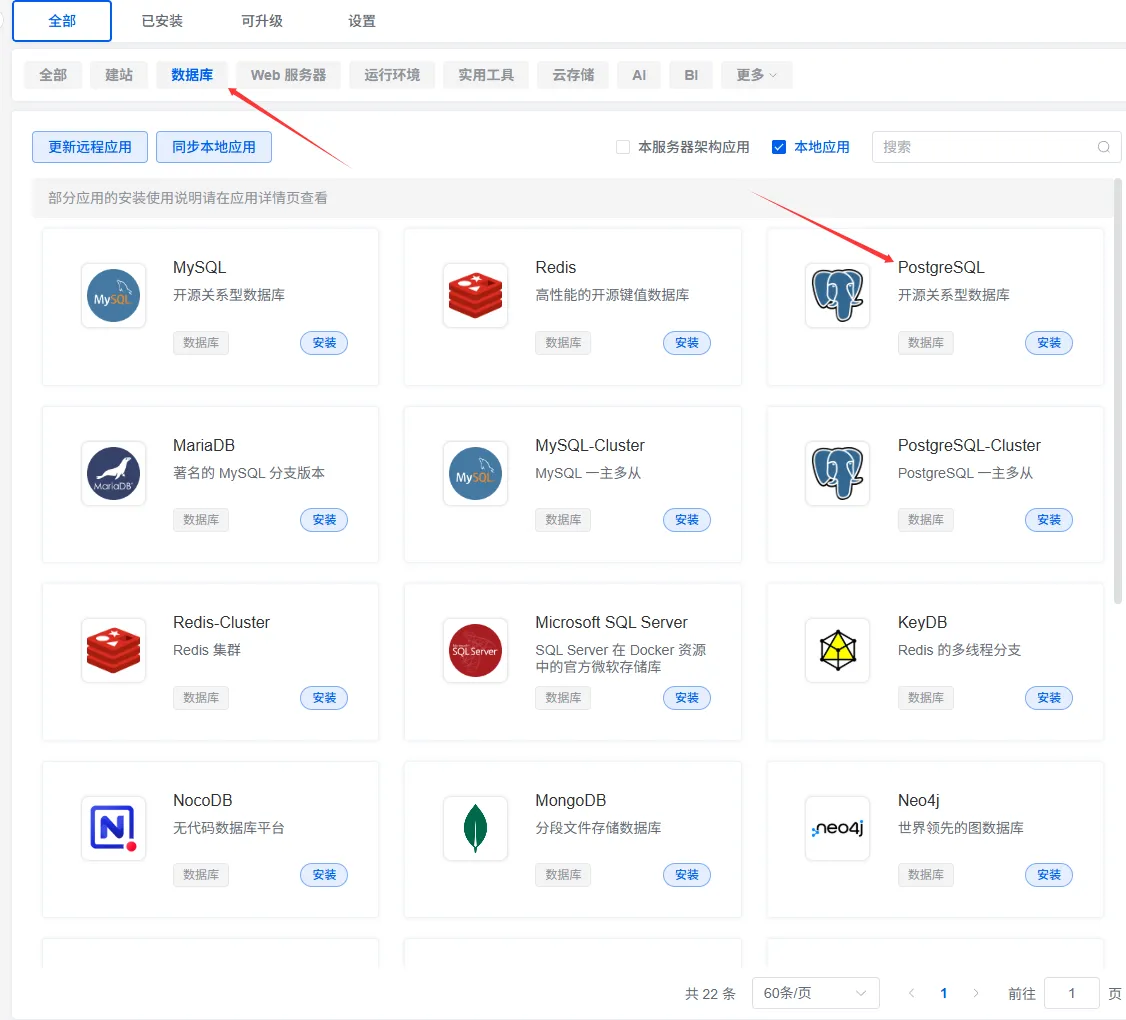 1.之后我们选择数据库项,点击安装PostgreSql数据库,该数据库相比较Mysql会更先进性能更好,我比较推荐