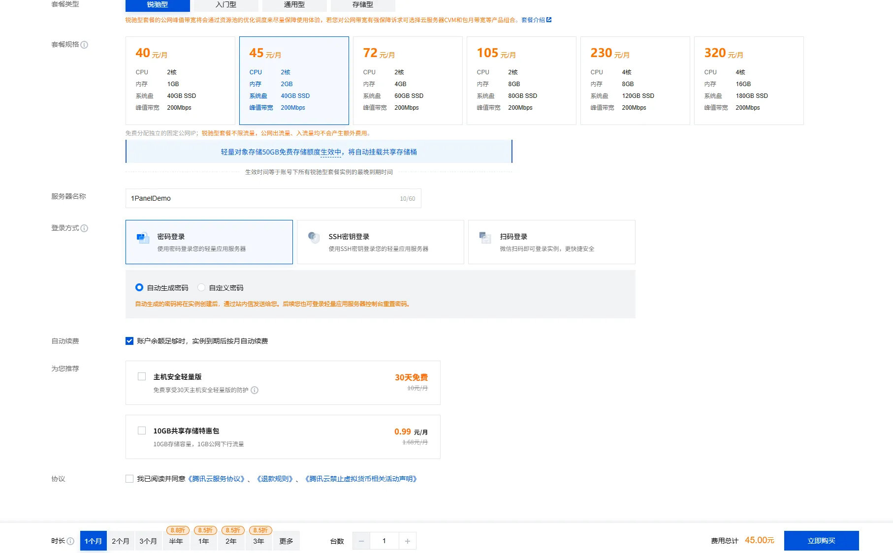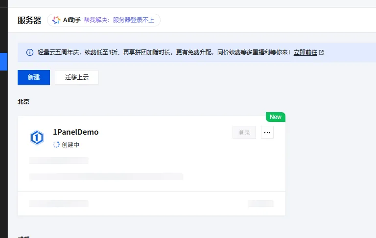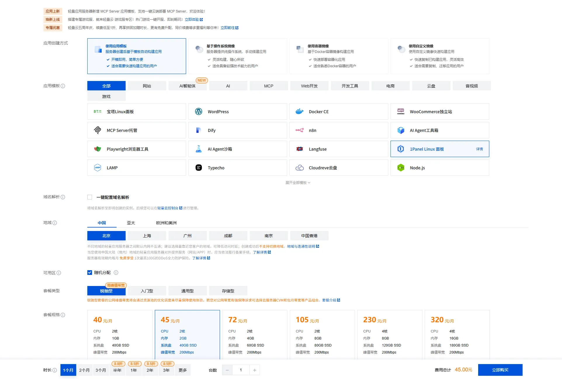建站,我们会需要什么?没错是存储网站内容的地方,也就是服务器空间,所以我们需要先购买一台服务器,本文我们采用北京地域的服务器进行演示 购买轻量应用服务器,当我们进入购买页面后我们可以直接选择1Panel的模板进行快速预装,这样就省下了手动再次去安装1Panel的步骤更高效方便