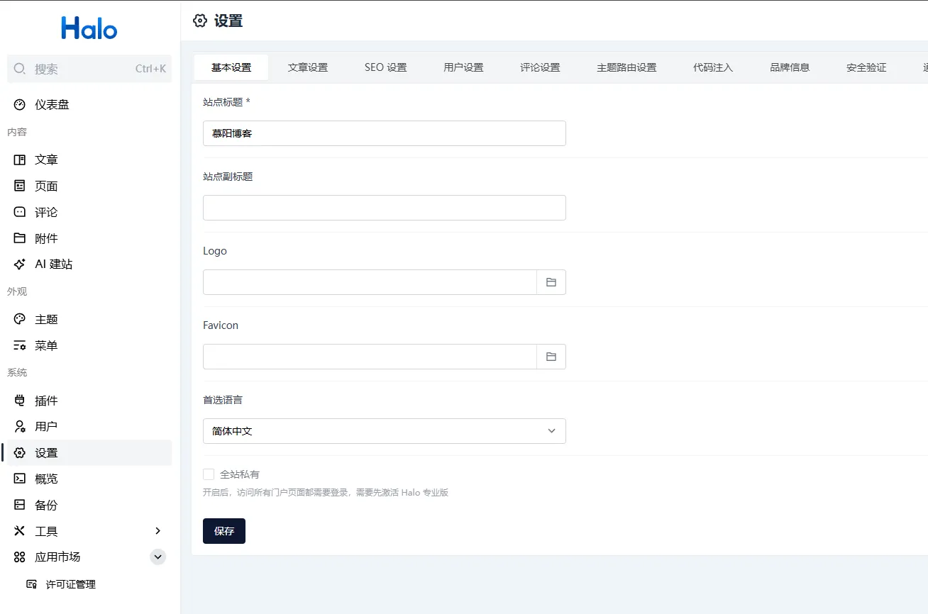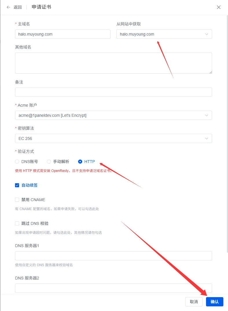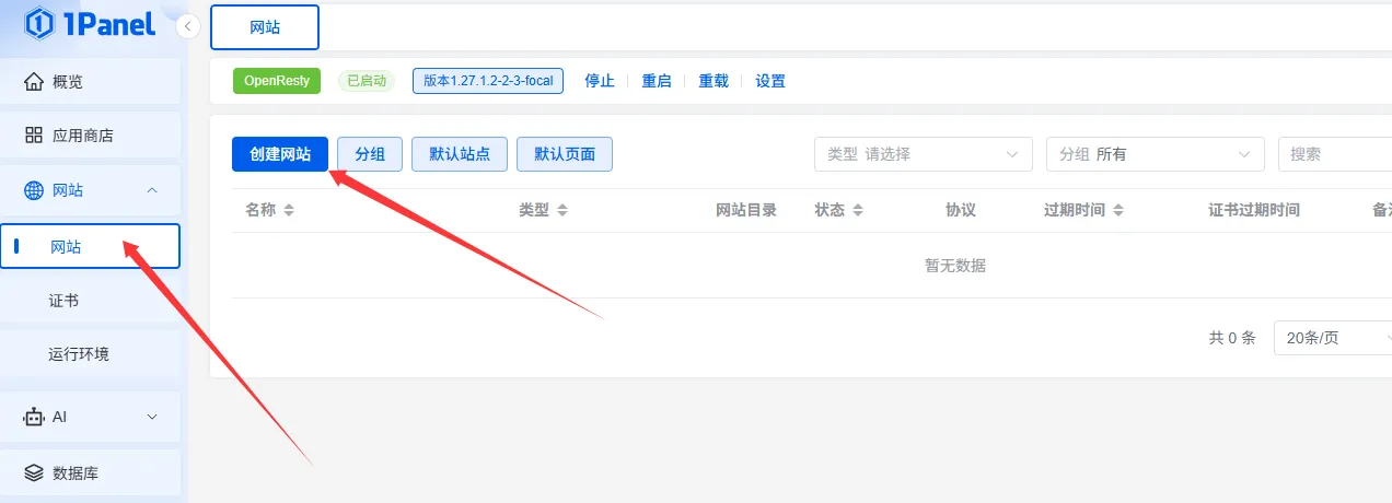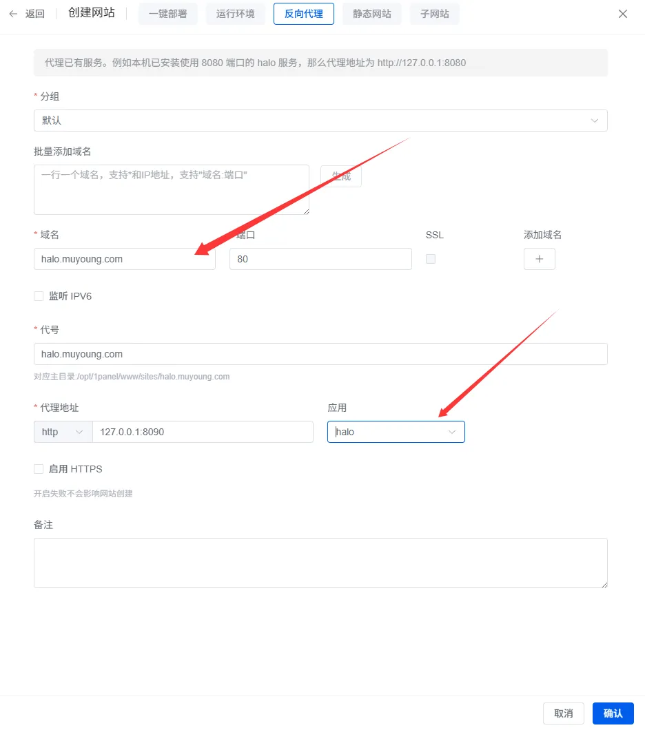 1.之后点击网站-创建网站,选择反向代理,输入访问博客的域名,然后应用直接选择halo会自动填写内网的配置