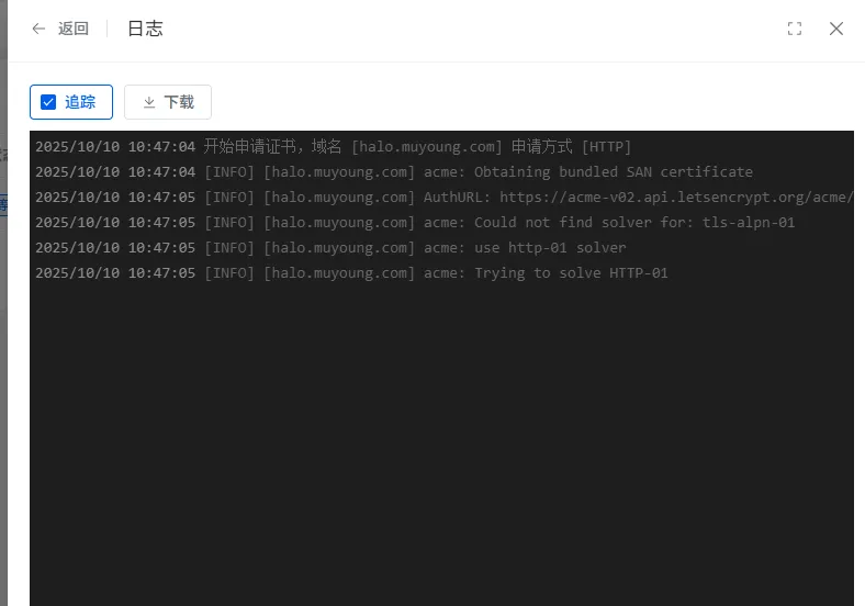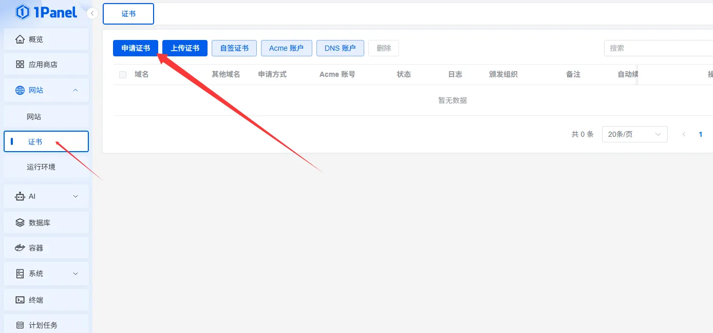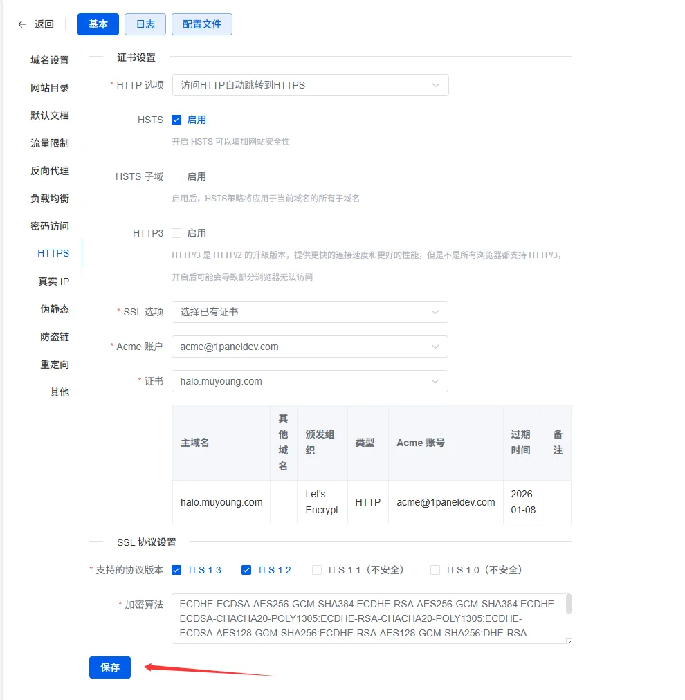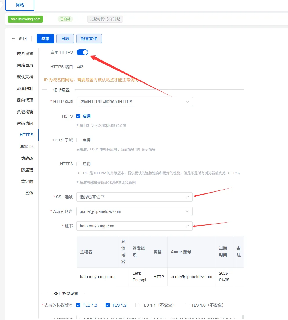 4.证书签发完成之后再次进入刚刚创建的网站配置里点击HTTPS,启用HTTPS功能,SSL选项选择已有证书,证书选择我们上方配置对应域名的证书