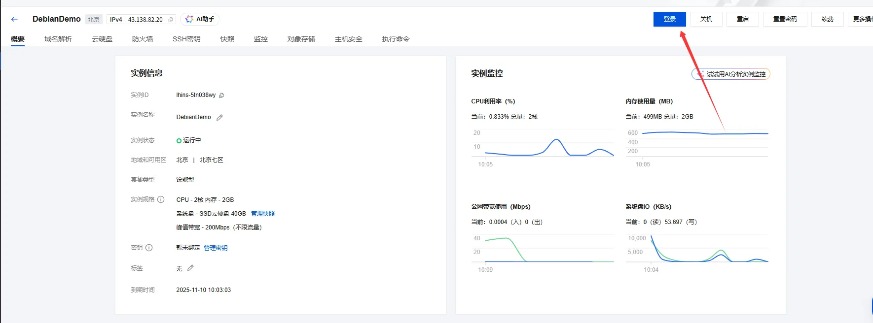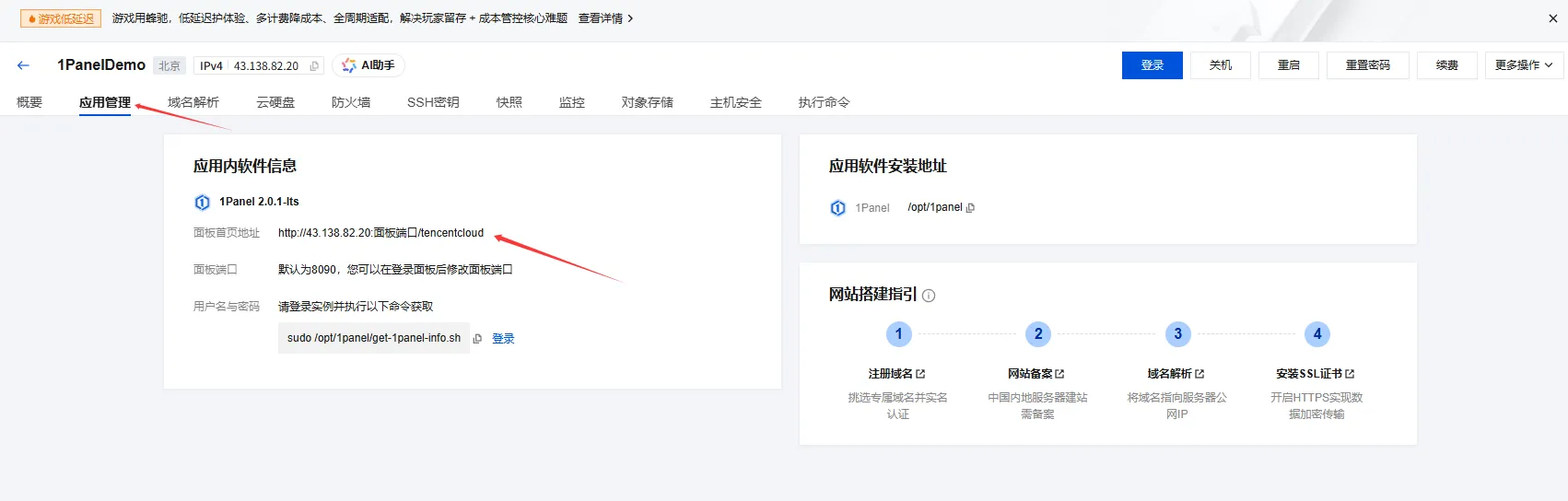 4.创建完毕之后点击服务器进入服务器的控制台页面,点击应用管理就可以看到1Panel已经预装好了,并且告知我们访问的url,需要在服务器防火墙放行对应的面板端口(一般使用这种方式会自动放行端口)