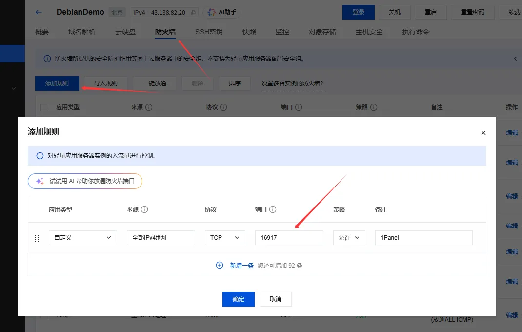 7.点击防火墙,选择添加规则,选择全部ipv4地址端口我们填写上方显示的16917,写上备注1Panel代表这个端口放行的是1Panel