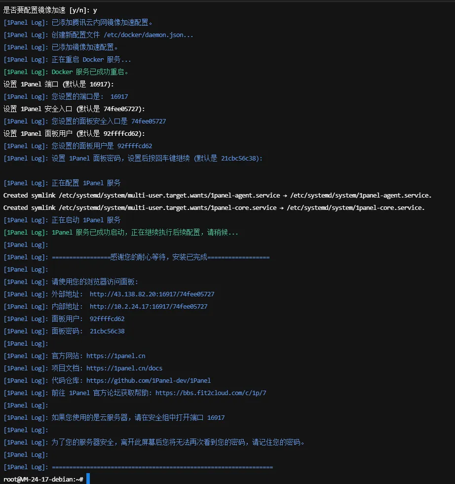 6.是否配置镜像加速(选择Y)其他设置都可以保持默认,安装完毕之后我们可以获得登录的地址以及用户名密码,同样我们也需要在云服务器防火墙放行对应的端口