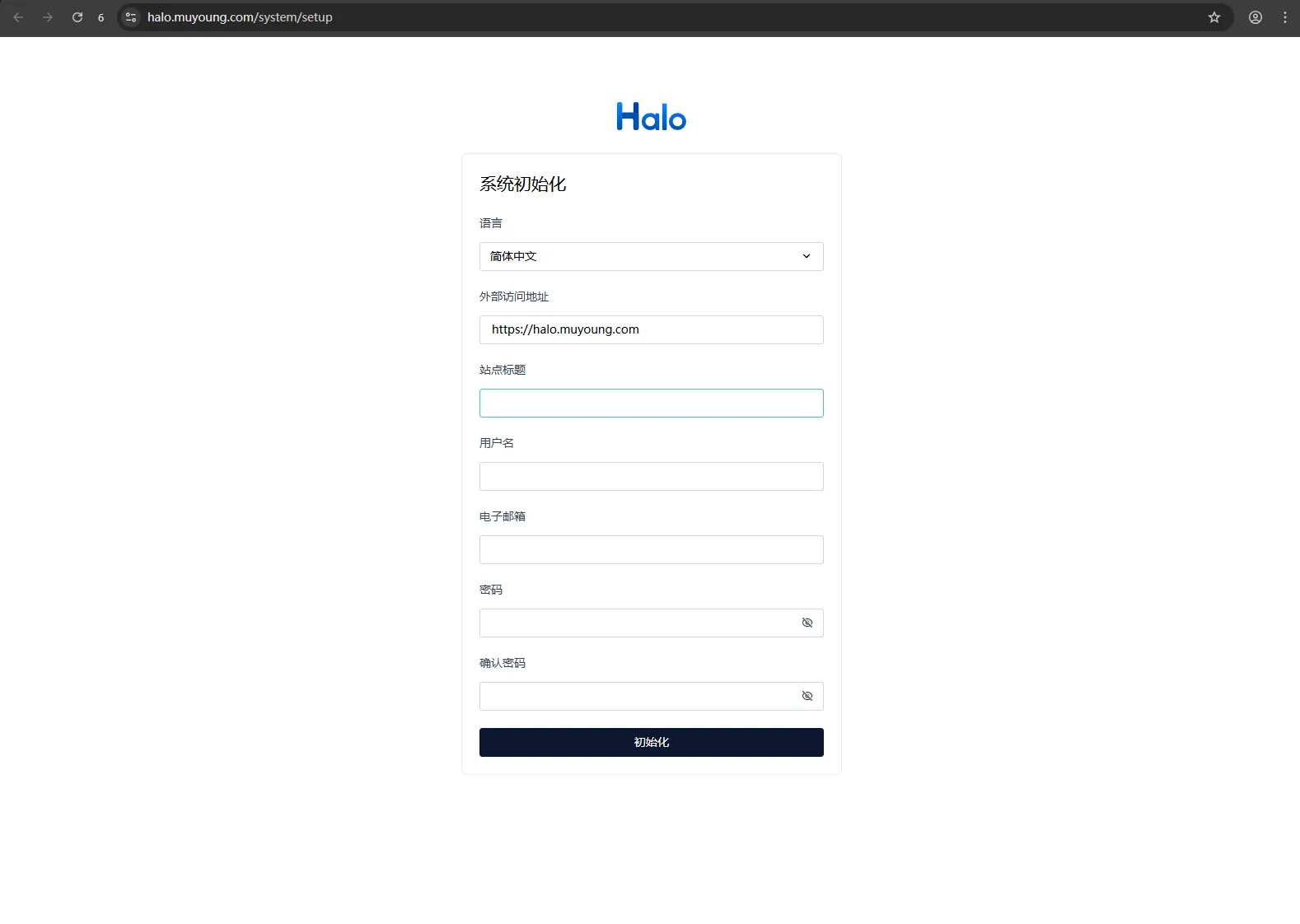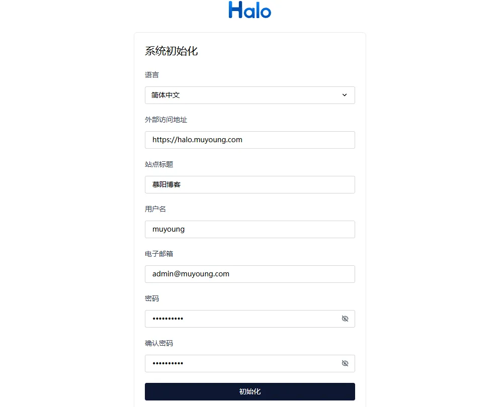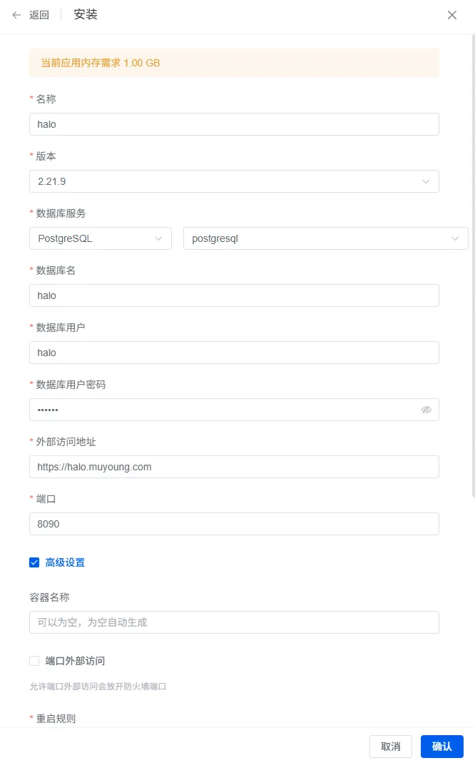 3.数据库名跟密码我们可以默认也可以进行自定义,外部访问地址一定要填写后面用户访问博客的域名地址,点击确定安装
