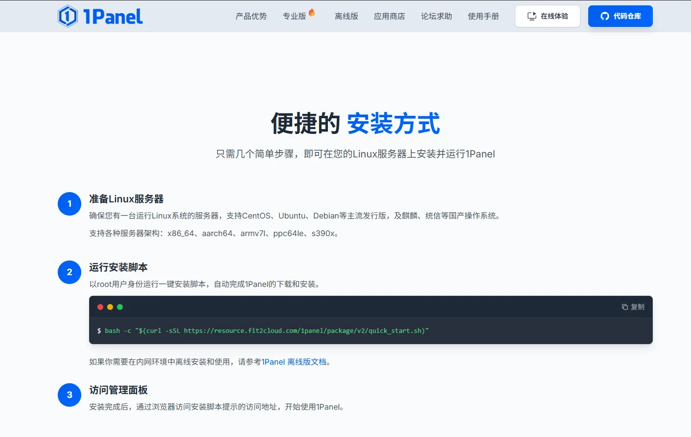 4.进入1Panel官网点击前往找到下方的安装脚本复制到服务器运行