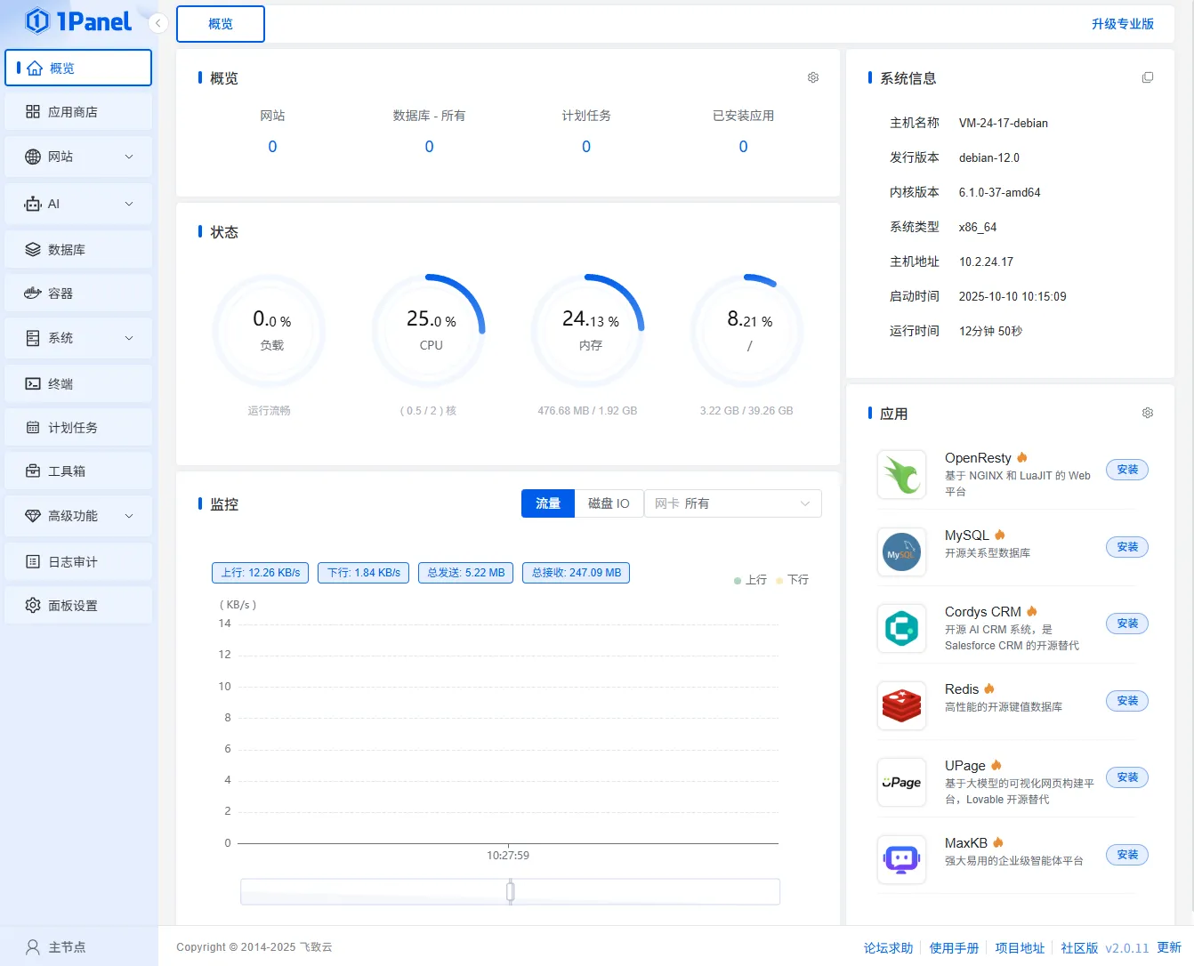 打开提供的url,就可以进入1Panel的登录页,输入用户名密码登录