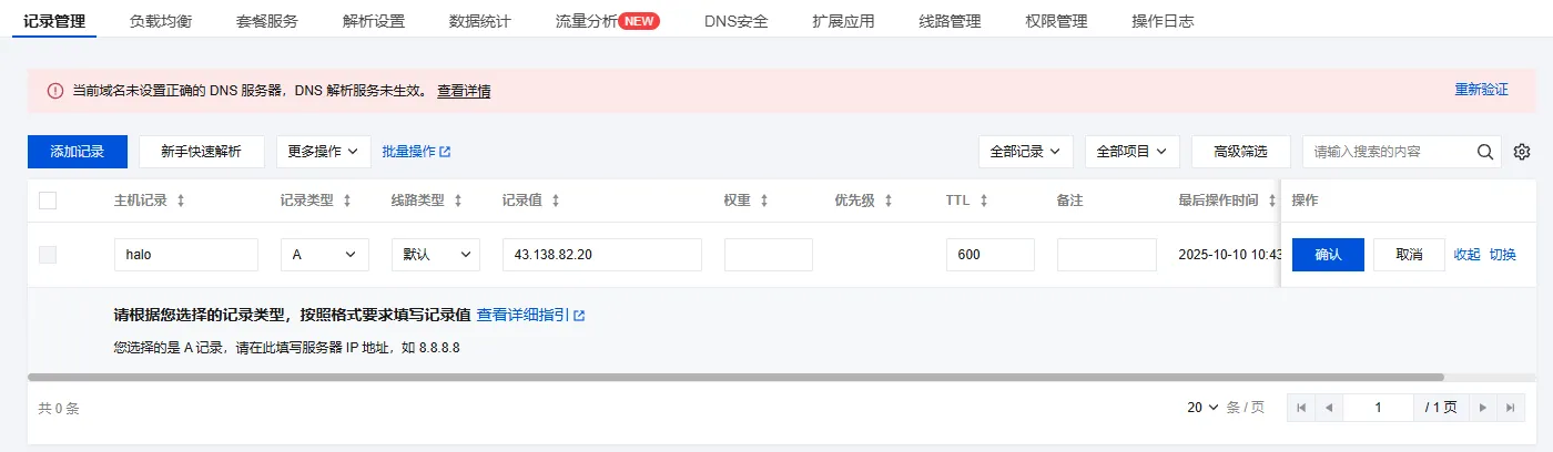 3.主机记录填写halo记录类型为A,记录值填写服务器的ip地址,点击确定添加即可