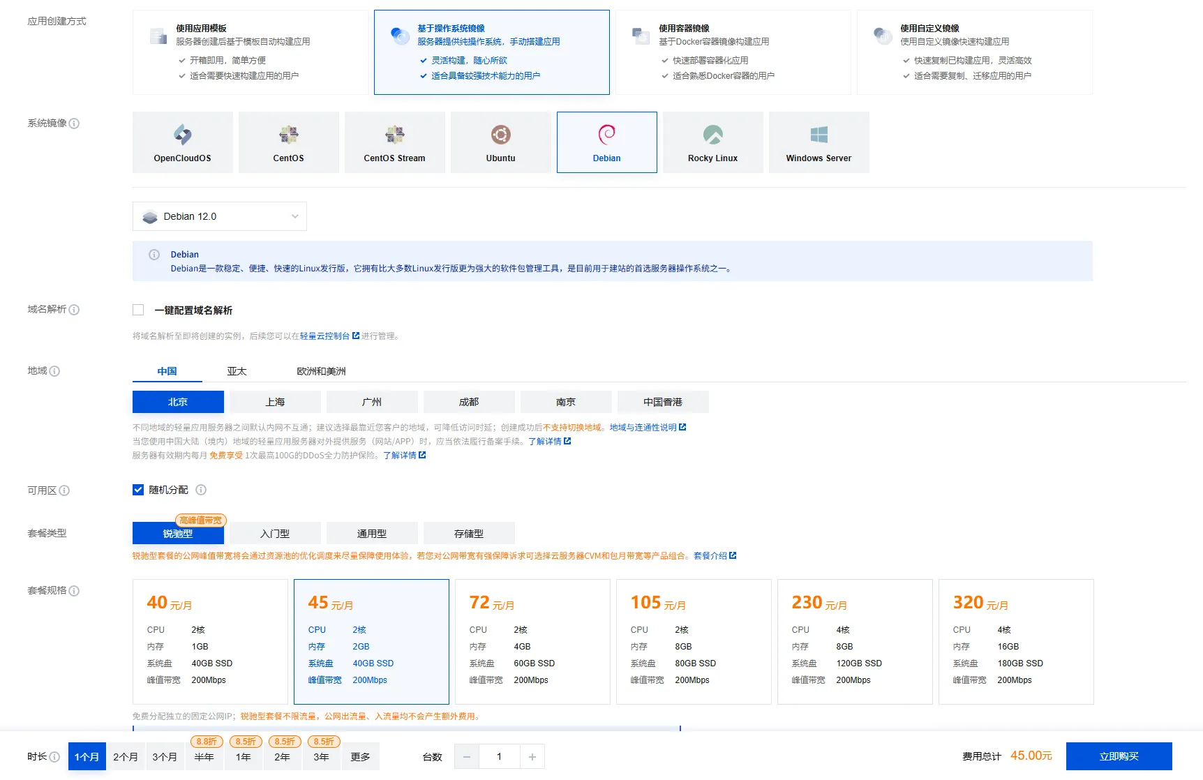 1.该方法与上方差异不大,应用创建方式选择基于操作系统镜像的安装方式,本文我选择使用Debian12操作系统进行演示