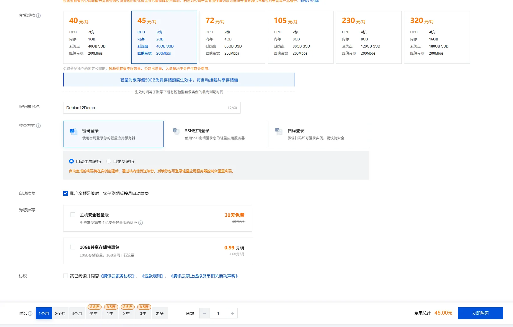 2.依然选择2核2G,服务器名称可以填写也可以不填写自动生成,密码可以设置也可以选择自动生成,点击立即购买
