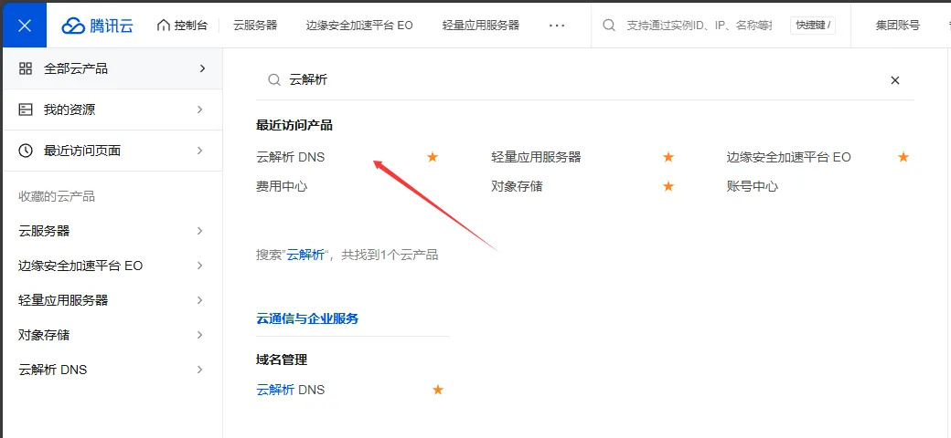 1.在腾讯云产品里搜索云解析点击云解析DNS