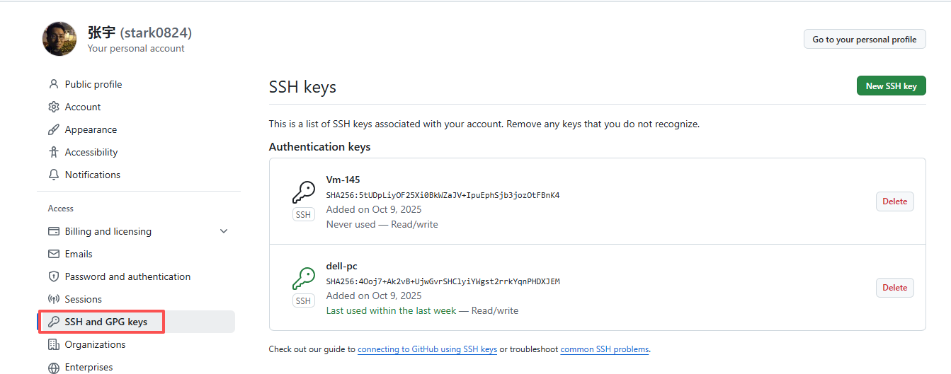 就是本地生成的公钥,注册一个GitHub账号,把本地生成的公钥配置在Github,点击头像找到 SSH and GPG keys