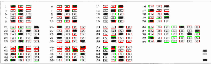 按照这篇论文中寻找目标区域的方法,可以一定程度上规避由于学生填涂偏移造成的误差,相对于之前使用的外扩矩形中直接进行二值统计的方法,也更大程度上减少了额外的干扰区域,对于客观题识别准确度有一定的提高。
