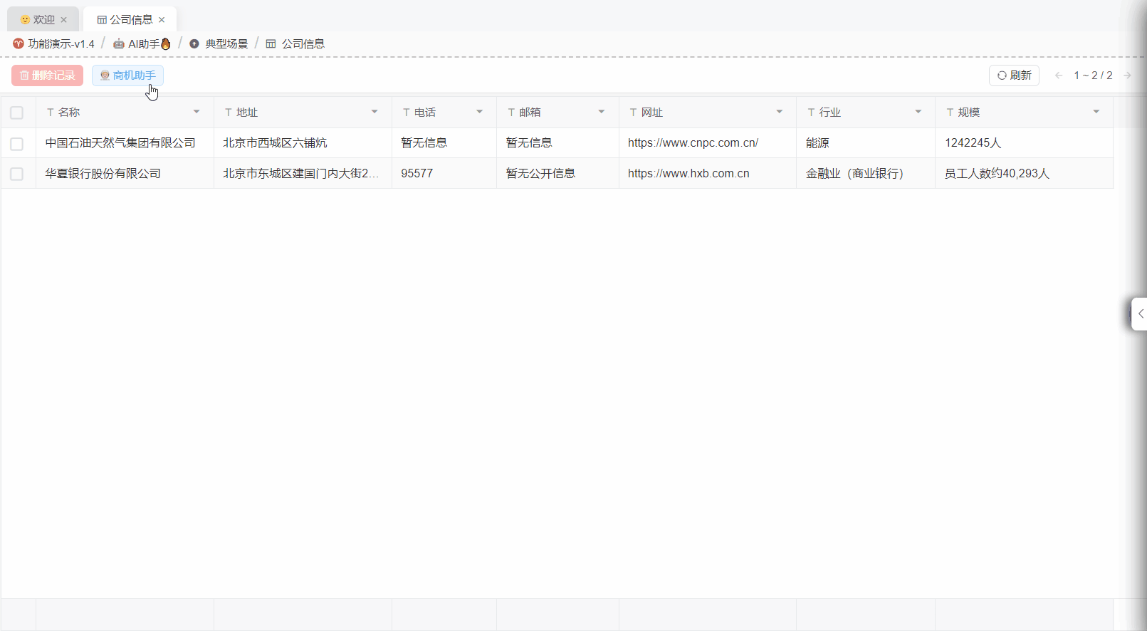 例如在“客户管理场景”中,销售人员可以针对现有商机,通过调用网络查询的能力,让AI助手自动补充行业、主营业务、法人、注册资本等关键信息,快速丰富商机内容。