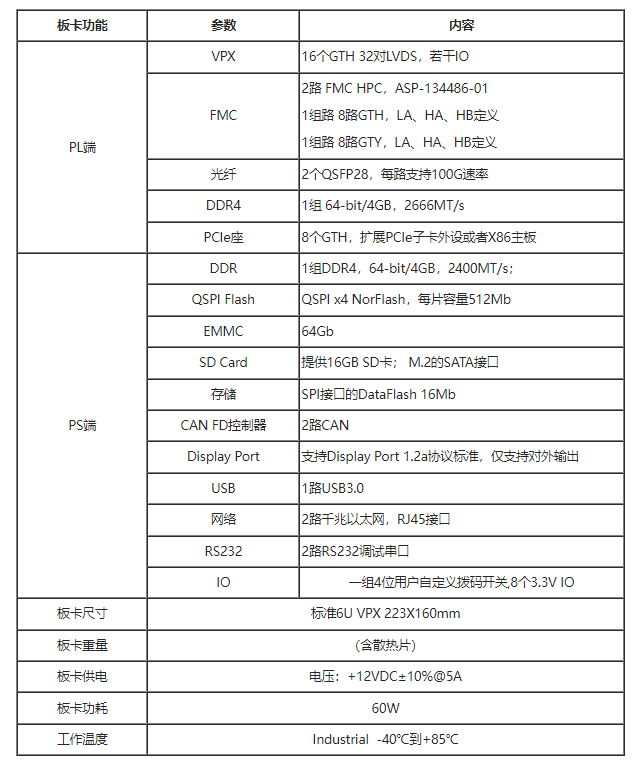 该板卡是采集、存储、计算、管理一体的高集成度、加固型的信号处理平台,北京太速科技板卡基于Xilinx公司Zynq UltraScale+ MPSOC系列SOC XCZU19EG-FFVC1760架构,其中,ARM端搭载一组64-bit DDR4,总容量达4GB,可稳定运行在2400MT/s,板卡ARM对外支持1路USB3.0接口、2路千兆以太网接口、1路DP输出接口、2路调试串口(RS232)、2路Can接口;板卡具有自控上电顺序,支持多种启动模式,如Nor Flash启动,EMMC启动,SD卡启动等。PL端扩展两路标准FMC HPC接口,支持8路GTH(GTY)接口和LA/HA/HB全定义接口;PL端支持一组64-bit DDR4,容量均为4GB,最高运行速率支持2666MT/s;PL端8个GTH扩展PCIe接口,2个QSFP28 100G光纤;6U VPX 接口支持16个GTH和32对LVDS。板卡设计满足工业级要求,可用于高速信号的采集,存储和计算,管理一体化设计应用。