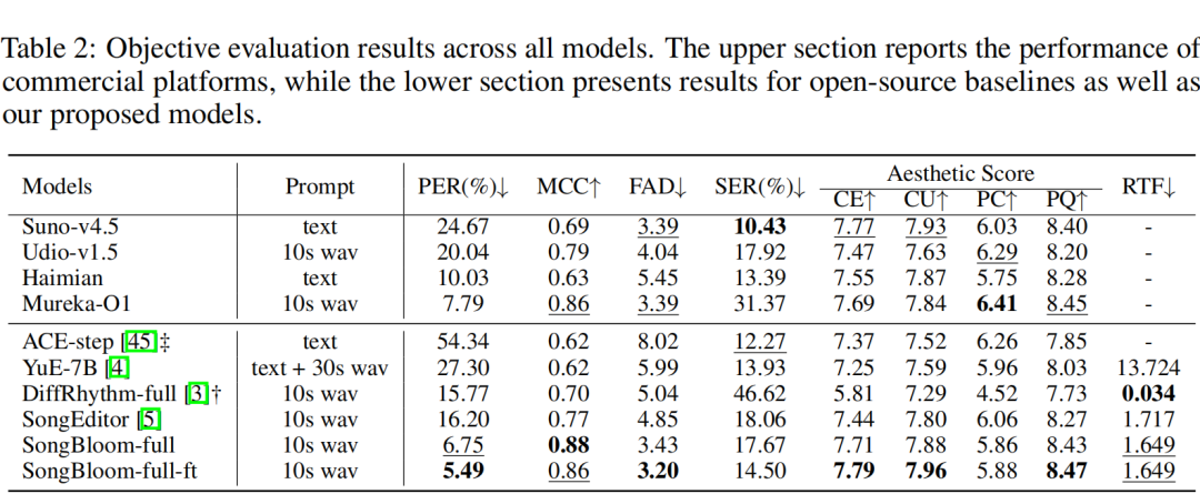 在客观指标层面,SongBloom 的美学评分不仅远超开源基线模型,更与顶尖商用模型 持平甚至实现超越;同时,模型具备极强的歌词 follow 能力,大幅减少 “幻觉生成”(生成内容与歌词不匹配)现象,显著降低了音素错误率(PER),让歌词准确性达到行业新高度。