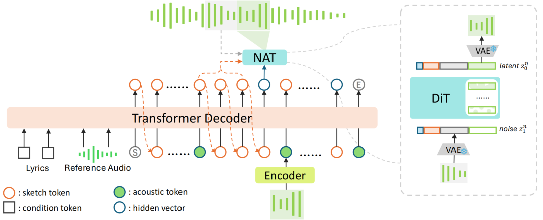 ● 首次将自回归扩散模型引入长时歌曲生成任务。模型以离散的 sketch token 作为 “链式思维” 式中间提示,结合 VAE latent(变分自编码器潜在空间)输出最终结果 —— 这一设计既完整保留了自回归模型在结构连贯性、音素对齐上的优势,又充分发挥了扩散模型在连续特征生成中对音质的提升作用,最终实现 “结构稳、细节满、表现力强” 的歌曲生成效果。