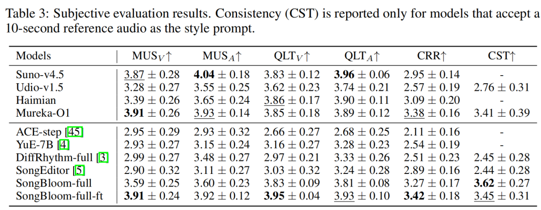 在主观听感评测中,SongBloom 的表现同样惊艳。得益于 VAE latent 保留的丰富声学细节,其人声音质细腻度直接超越目前顶尖闭源商业模型 Suno-v4.5;而在音乐性上,也达到了媲美甚至超越部分闭源商业模型的水平,让 “AI 生成音乐” 更贴近专业创作质感。