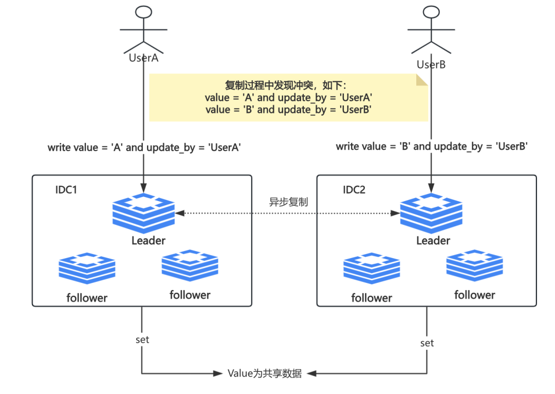 这里还是举上一篇的例子,多人文档协同编辑场景,在这个场景下不同User都可以对同一个共享资源进行编辑修改并保存,而且这种修改保存会覆盖上一次数据最新的数据。那么在这个场景下产生数据冲突不仅体现在多用户并发编辑导致的冲突,同时在多数据运营中心之间数据复制也会产生冲突.