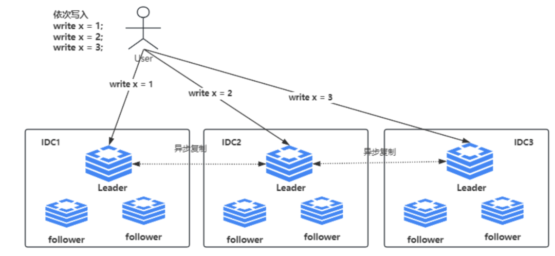 如果上述三个操作放在单主复制模型的部署架构中, 那么由于操作发起者都是同一个UserA并在时间序列上就具备顺序性, 这种顺序性体现上述三个操作事件之间的因果关系, 于是我们就不存在所谓的冲突问题. 但是如果是放在多主复制模型的部署架构中就会存在问题, 依次写入但都路由到不同的IDC中, 如下: