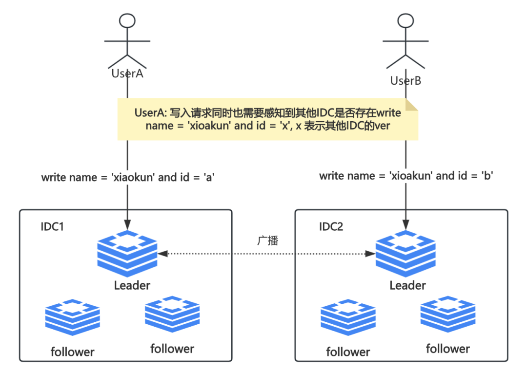 但是仅仅全序在有些场景还不够, 比如是具备唯一性约束的name, 那么其在Multi-Leader复制模型的部署架构中, 其关注点是数据值冲突, 它要求我们在接收用户请求层面面临数据值冲突的时候要进行决策, 如下所示: