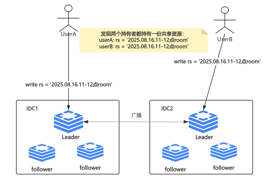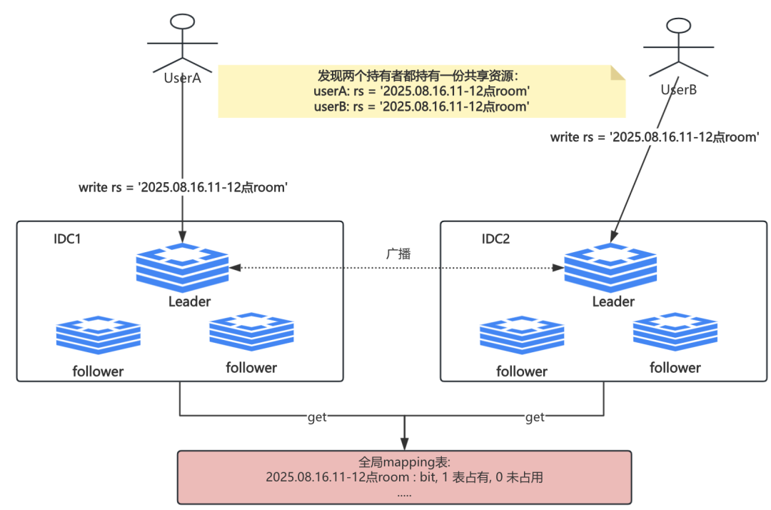 此外还有一个很重要的因素, 前者我们无法预测资源, 后者由于是共享资源, 这类资源一般是系统提供, 因此系统对这类资源分布是可预测, 因此除了考虑上述的解决方式之外, 由于我们对资源是具备可预测的, 因此可以提前分配和设计来避免引入更为复杂度的问题, 比如上述的广播实现是一个多轮共识问题, 但是对于内部资源, 比如预订会议室这类共享资源, 我们会提前为系统资源建立一份资源占用的全局表, 利用全局表来间接帮助我们实现广播机制, 这个时候我们共享且仅被覆盖的一次数据值方式就演变为如下方式: