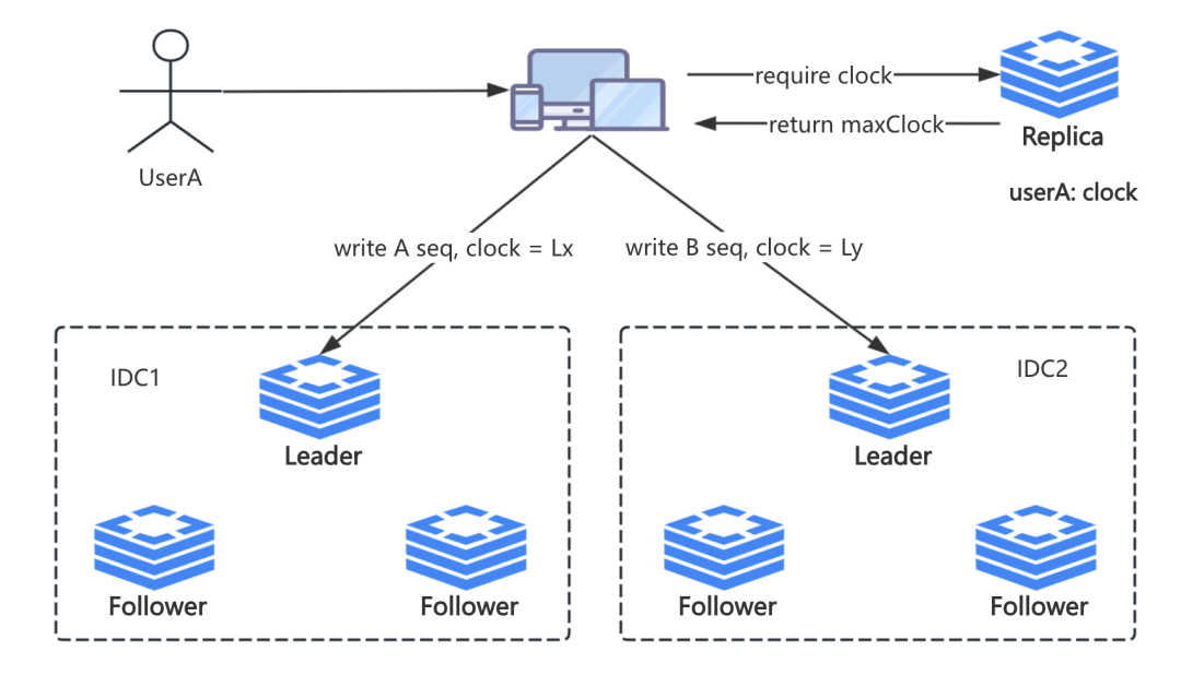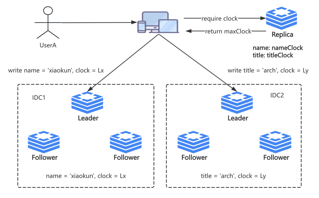 以开头的UserA向双主部署架构的Replica发起一系列的写入操作, 这个时候我们将系统时间戳替换为Lamport Clock, 那么基于Lamport Clock的原理可知, 需要存储UserA持有的clock, 而这个clock对于持有多端设备的UserA而言是相同, 那么这个时候我们就需要增加维护一份UserA对应的clock存储: