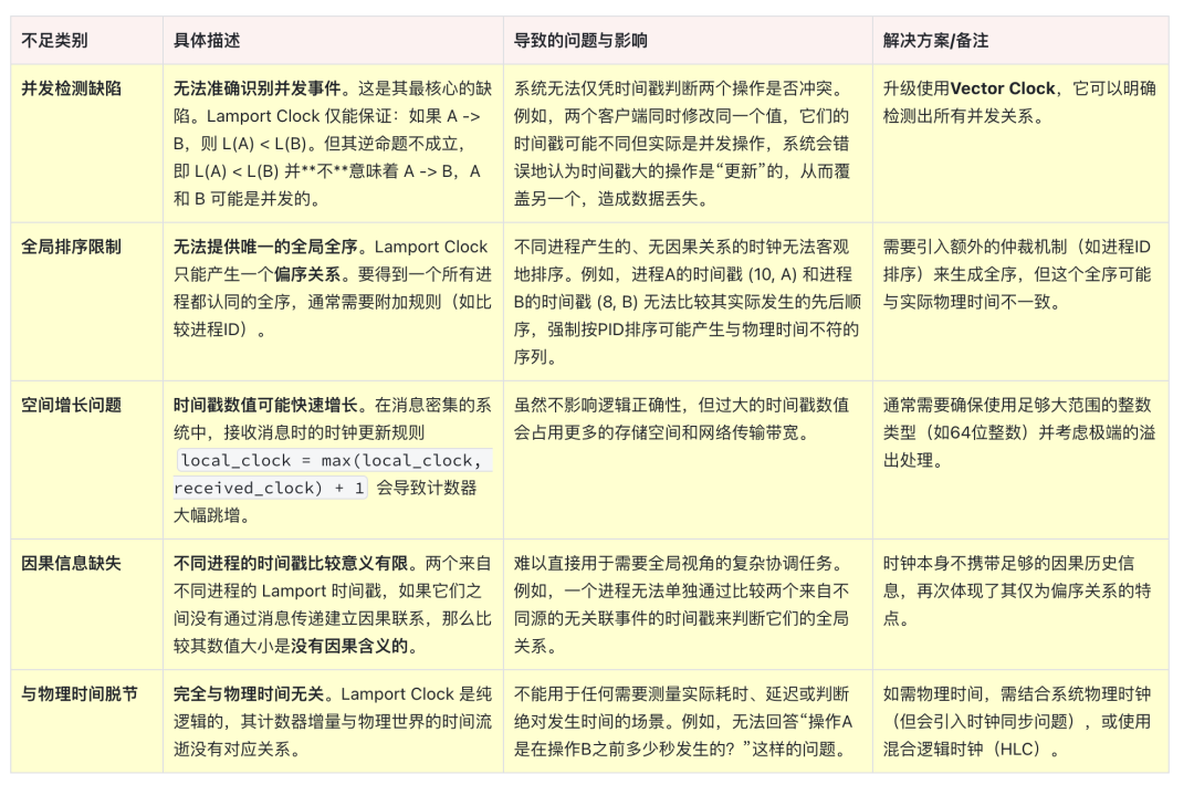 我们通过上述针对Lamport Clock的原理以及偏序的阐述, 现也将Lamport Clock存在的局限性总结如下:
