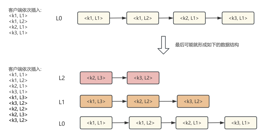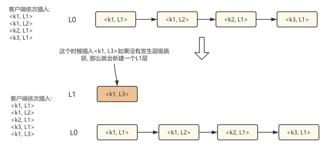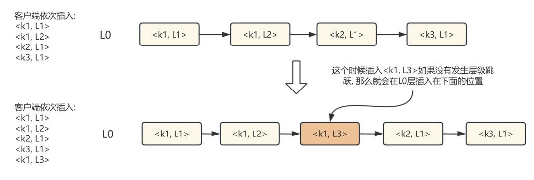 如下我们采用链表的方式存储组成一个不同key的多版本序列, 类似于我们LevelDB的跳表结构, 假设有k1, k2, k3 三个key, 分别对应4个递增的版本号L1, L2, L3 且满足 k1 < k2 < k3, 我们定义versionedKey值越大越靠右边, 假如这个时候我们已经向MVCCStore存储依次写入对应的一系例versionedKey, 如果此时插入<k1, L3> 没有发生层级跳跃, 那么就会在L0层插入在<k1,L2>与<k2, L1> 之间, 如下: