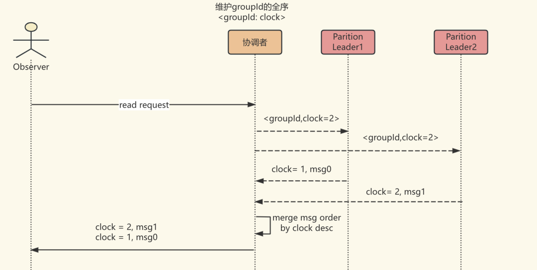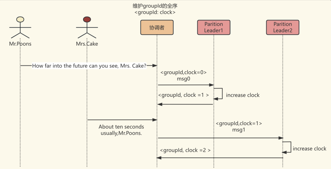 上述这种情况我们称之为一致性前缀读(Consistent Prefix Reads), 其中Mr.Poons 以及 Mrs.Cake在群聊中前后发起的对话是具备因果关系, 因此如果我们考虑采用Lamport Clock来捕获群聊发起的对话事件操作, 那么要怎么实现呢?