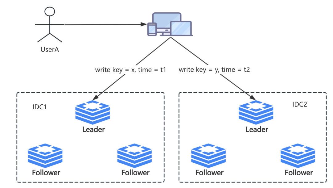 在讲述之前, 我们先来分析下在多个Replica节点允许写操作的场景, 比如在下面的一个Multi-Leader 双数据中心的部署架构, 我们有一个UserA 向我们系统依次发起一系列的key = x 以及 key = y 的写操作, 如下: