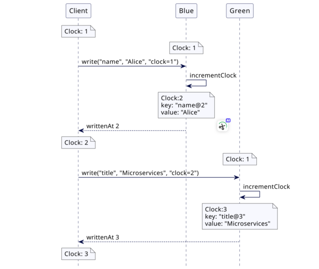 如果我们从请求的角度看Lamport Clock的操作, 同样以KV存储为例, 客户端client向两个存储副本节点, 即分别称之为Blue 以及 Green 节点, 这个时候我们很直观看到客户端操作事件上的顺序性, 如下: