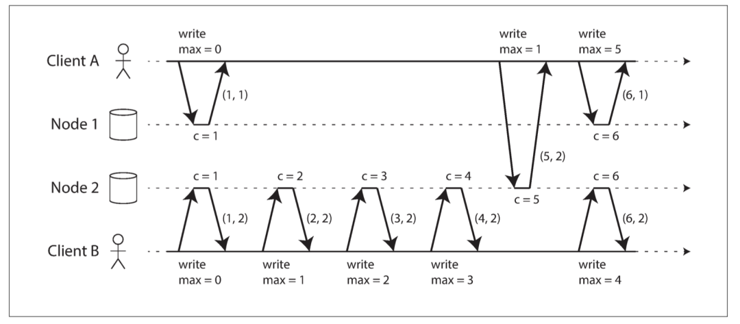 有了上述原理基础, 我们再回顾下之前在顺序与因果关系一致性提及的Lamport Clock例子, 其中组成的versionedKey为<Clock, NodeId> 如下: