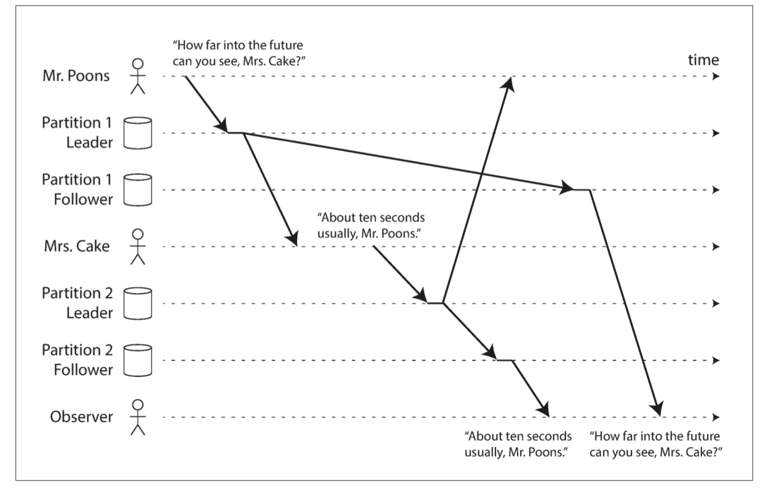 除了上述的场景, 我们之前也遇到过一个例子, 那就是在一个对话聊天中由于Replication Lag出现了一致性前缀读的情况, 即在一个IM系统中Mr.Poons以及Mrs.Cake都是在一个多人的群聊中, 并且聊天有这样的简短对话,如下: