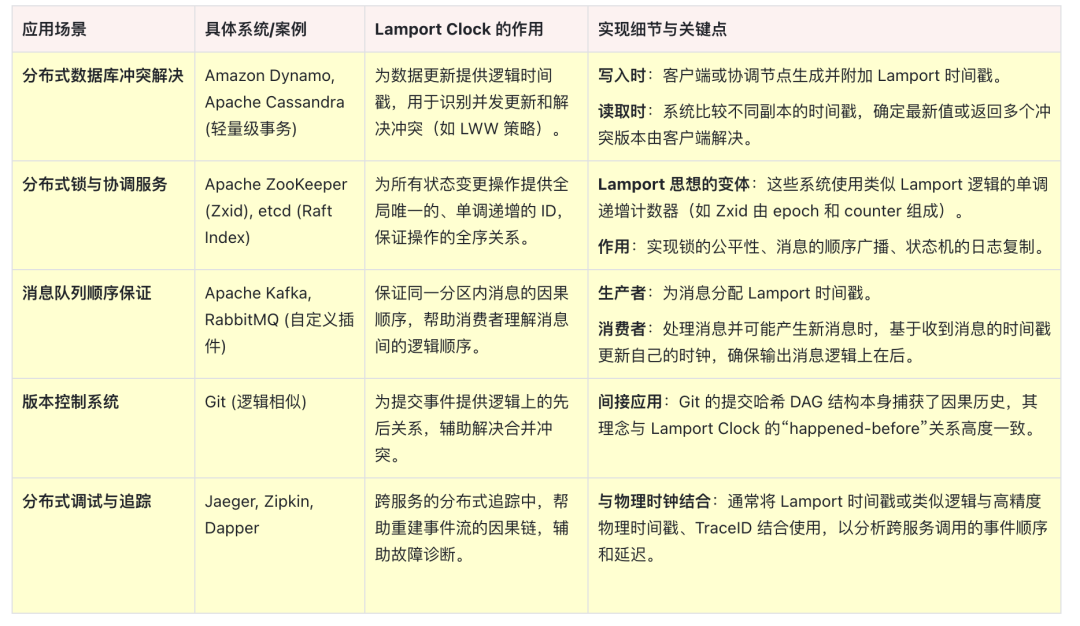 谈完Lamport Clock原理机制, 那么它在我们分布式系统中有哪些应用呢? Lamport 时间戳的核心价值在于其简单性和对因果关系的保证。它适用于以下需要轻量级事件排序的场景, 我将自己工作中遇到的各种可能场景进行汇总如下: