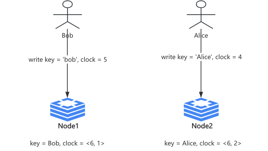 细心的你是否会发现, 如果我们ClientA 以及 ClientB 操作的是相同的key, 那么由于Node1 节点存储<6, 1> 以及 Node2 节点存储<6, 2> 的版本, 该以哪个为准呢? 如何进行决策呢? 正如下面的两个用户Bob 以及 Alice 分别向Node1 以及 Node2服务节点发起相同的数据key的写入操作如下: