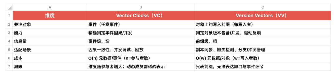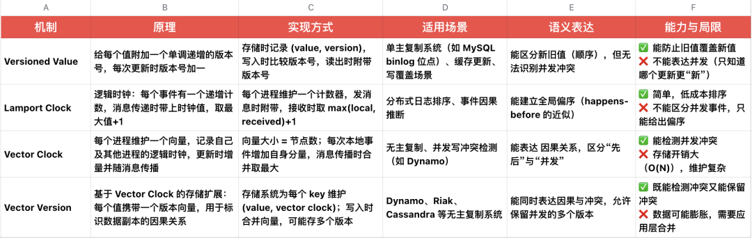 最后这里我也Versioned Value、Lamport Clock、Vector Clock以及Vector Verstion相关的区分汇总如下: